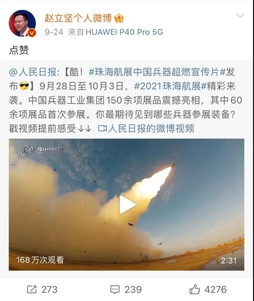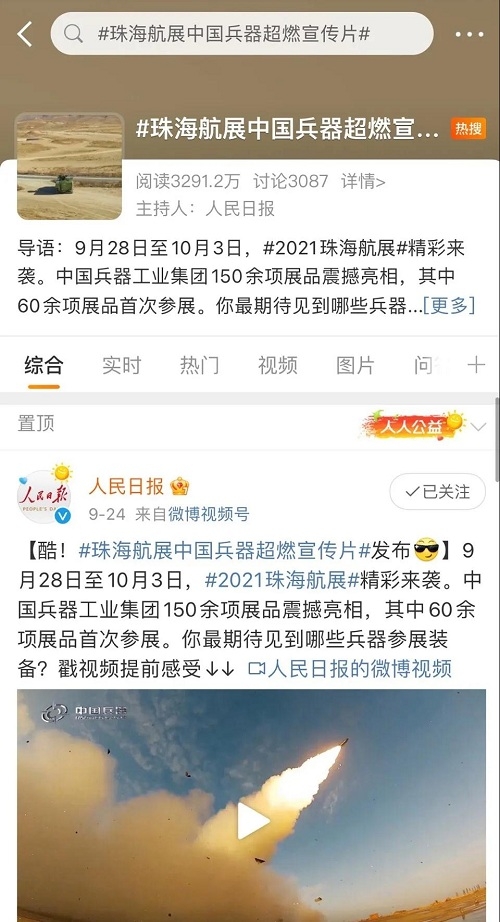 人民日報、新華社、中國日報、共青團(tuán)中央、國資小新、騰訊軍事、鳳凰軍事、新浪軍事等新媒體發(fā)布的集團(tuán)公司航展宣傳片等視頻作品燃爆全網(wǎng),閱讀量突破三千萬人次,得到外交部發(fā)言人趙立堅轉(zhuǎn)載點(diǎn)贊。集團(tuán)公司微信、微博、抖音號、微信視頻號等新媒體宣傳片播放閱讀量超過400萬人次。同時,央視新聞、新華社、中國之聲、央視軍事、央視新媒體、解放軍報、共青團(tuán)中央、國資小新、環(huán)球時報等多家媒體對集團(tuán)公司靜、動態(tài)展區(qū)進(jìn)行現(xiàn)場直播,在電視端、客戶端、微信視頻號、微博、B站、快手、抖音等平臺受到高度關(guān)注。著名軍事專家杜文龍、央視主持人顧國寧、央廣中國之聲主持人王藝等直播兵器館、動態(tài)表演區(qū)裝備。